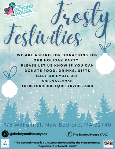 Your generous donations will provide our young adults with a warm and festive environment during the holiday season. The Beyond House would graciously appreciate any sponsorship or donation of goods or services. Your donation is tax-deductible, and our Tax ID is available upon request. To donate, please fill out the Google form here.